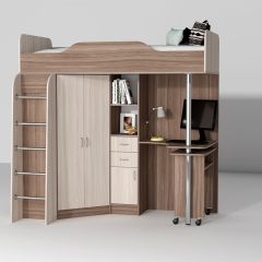 В комплект входит: кровать, внизу которой расположены вместительный угловой шкаф (полки и штанга), стеллаж для книг и компьютерный стол с дополнительным столиком.