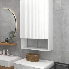 Белый шкаф с рифлёным фасадом будет отлично и стильно смотреться как в ванной, так и в туалете.